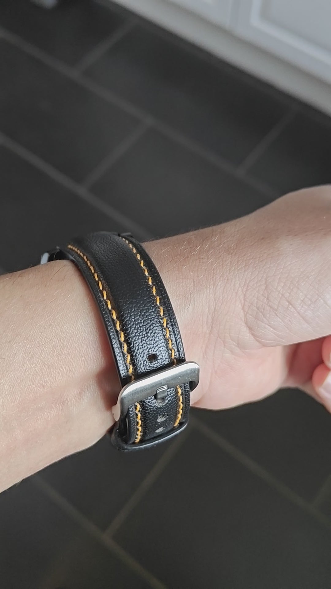 Den håndsyede læderrem er lavet af førsteklasses sort læder og syet med dyb orange tråd – en diskret kontrast, der matcher urkassens gyldne toner. Hver rem er håndlavet og helt unik.